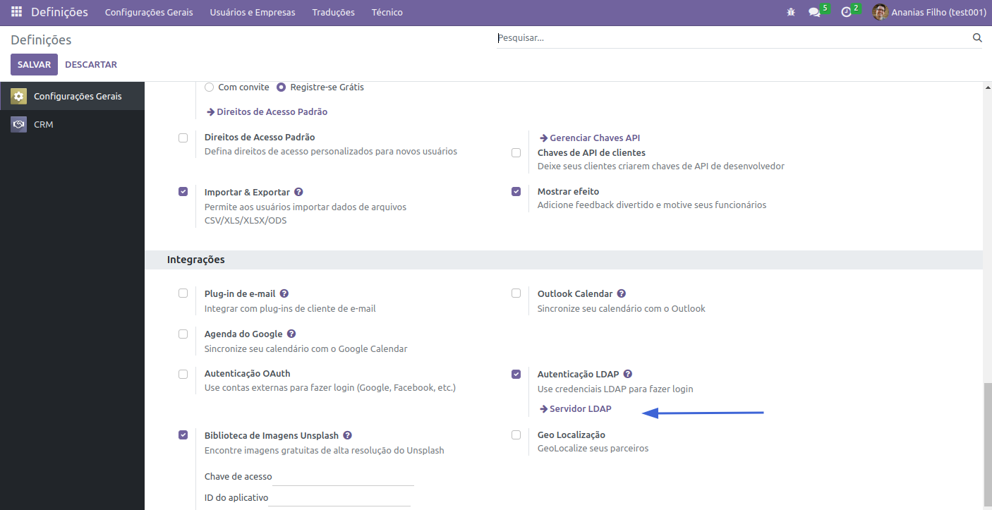 1. Acesse as definições ou configurações do seu Odoo. Em seguida procure pelo sub-item Integrações e marque a opção "Autenticação LDAP". Clique no botão SALVAR.