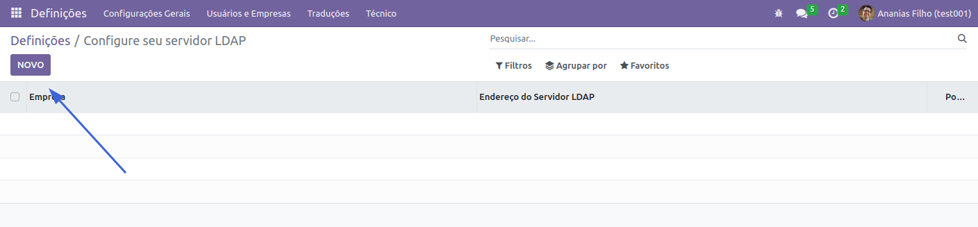 3. Você será redirecionado para a tela onde irá adicionar uma nova conexão com o servidor LDAP (no caso deste post, um servidor Microsoft Active Directory - AD). Clique no botão "NOVO" para adicionar uma nova conexão.