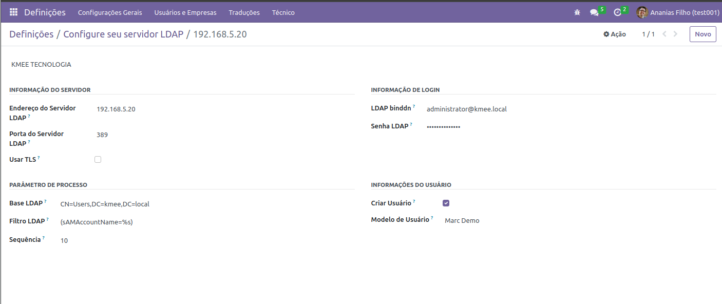 - LDAP binddn: administrator@kmee.local [Preencha com um usuário de leitura ou administrador do seu AD]