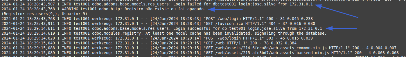 8. Verifique nos logs do Odoo (odoo.log) que a primeira tentativa de login retorna uma falha, porém, na segunda tentativa o usuário já está criado e o login é executado com sucesso.